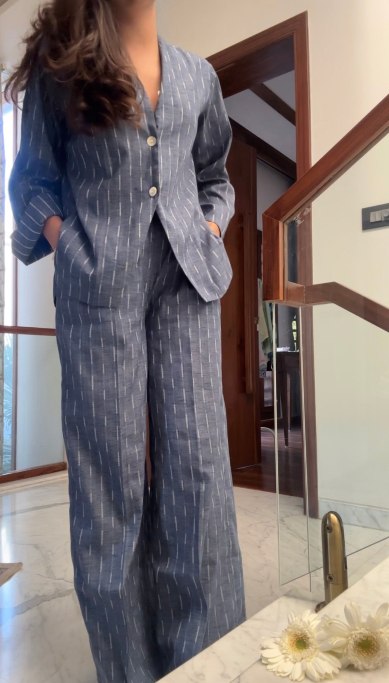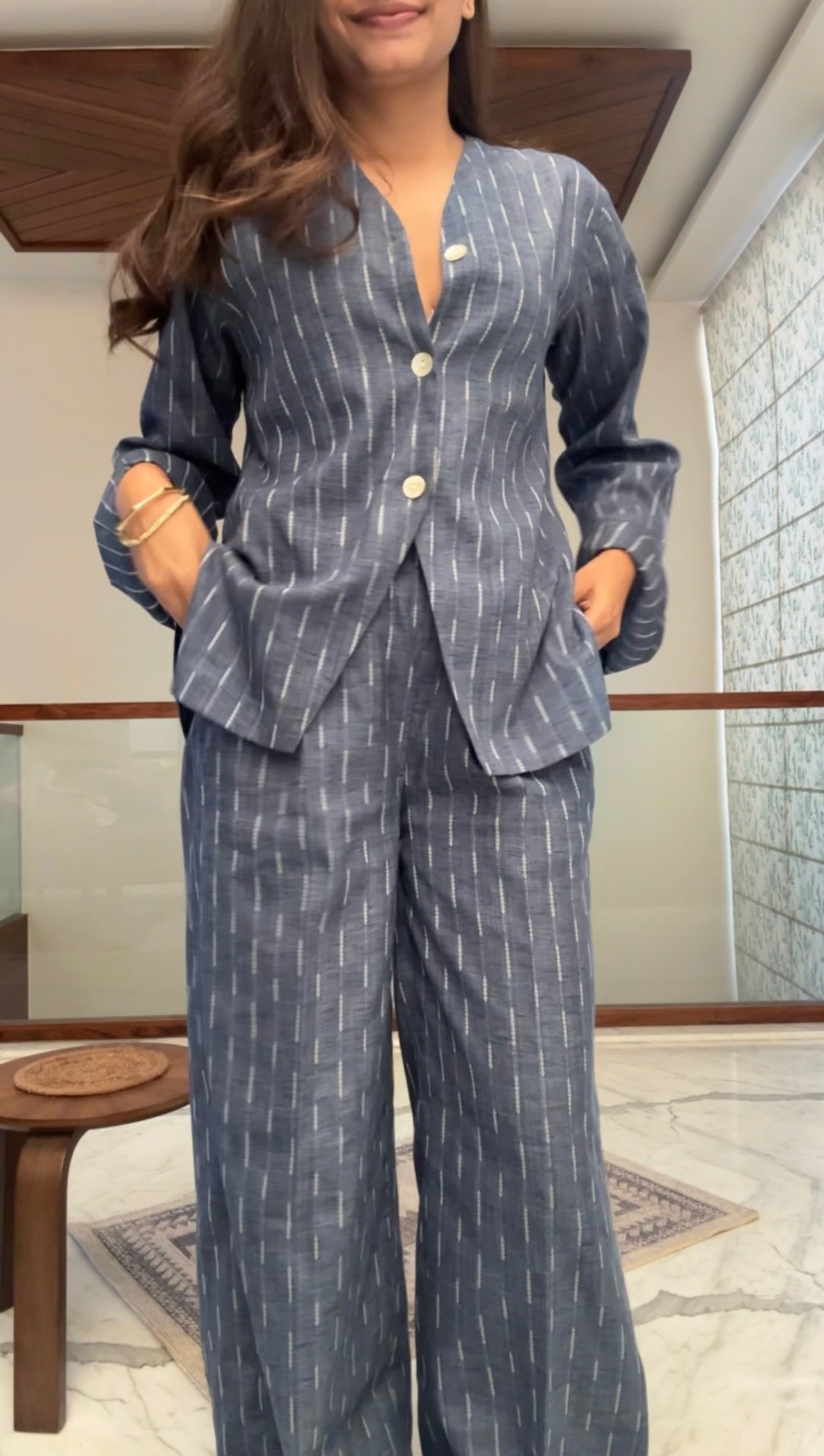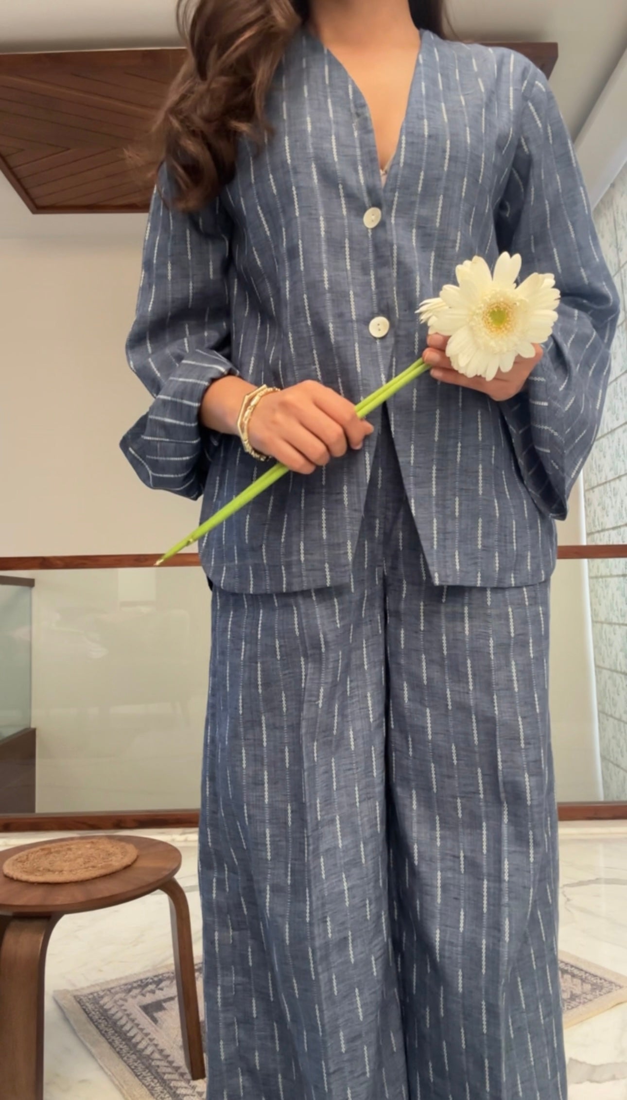 The Cloudline Set offers a versatile addition to your wardrobe. The coordinating set includes comfortable pants with a convenient pocket and a button down shirt featuring lining. Made with soft cotton jacquard in a stylish ash blue colour, this set is perfect for any occasion.