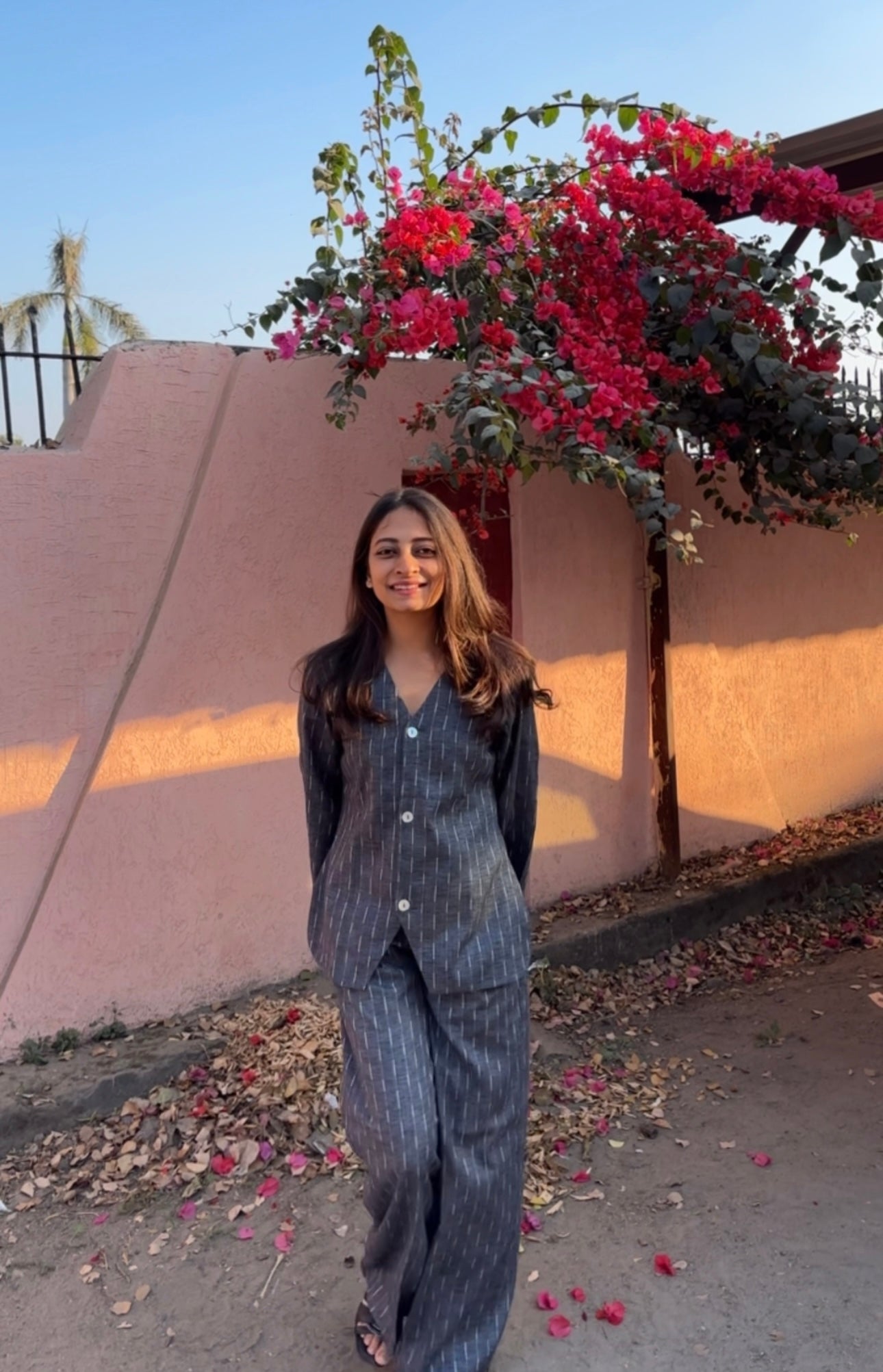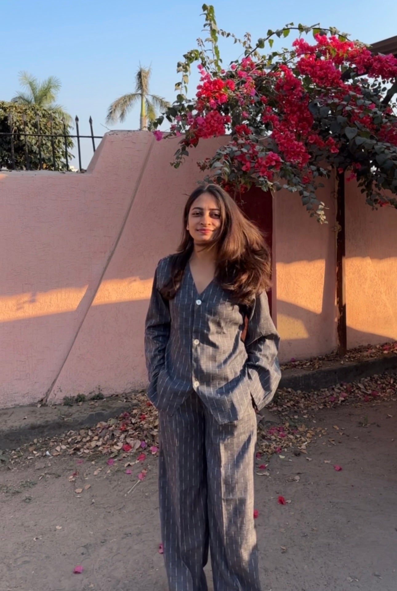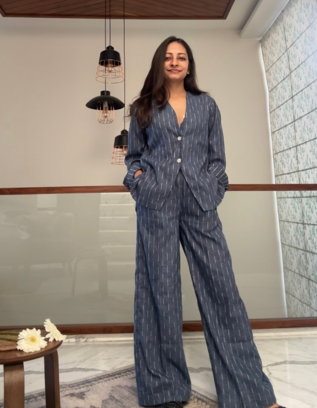 The Cloudline Set offers a versatile addition to your wardrobe. The coordinating set includes comfortable pants with a convenient pocket and a button down shirt featuring lining. Made with soft cotton jacquard in a stylish ash blue colour, this set is perfect for any occasion.